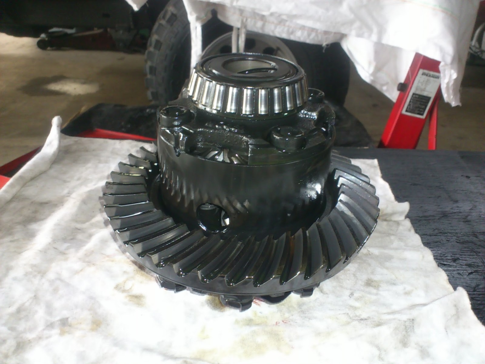 | サイドベアリングプレロード調整後、 ギアの当たりを見る為に一度仮組み |